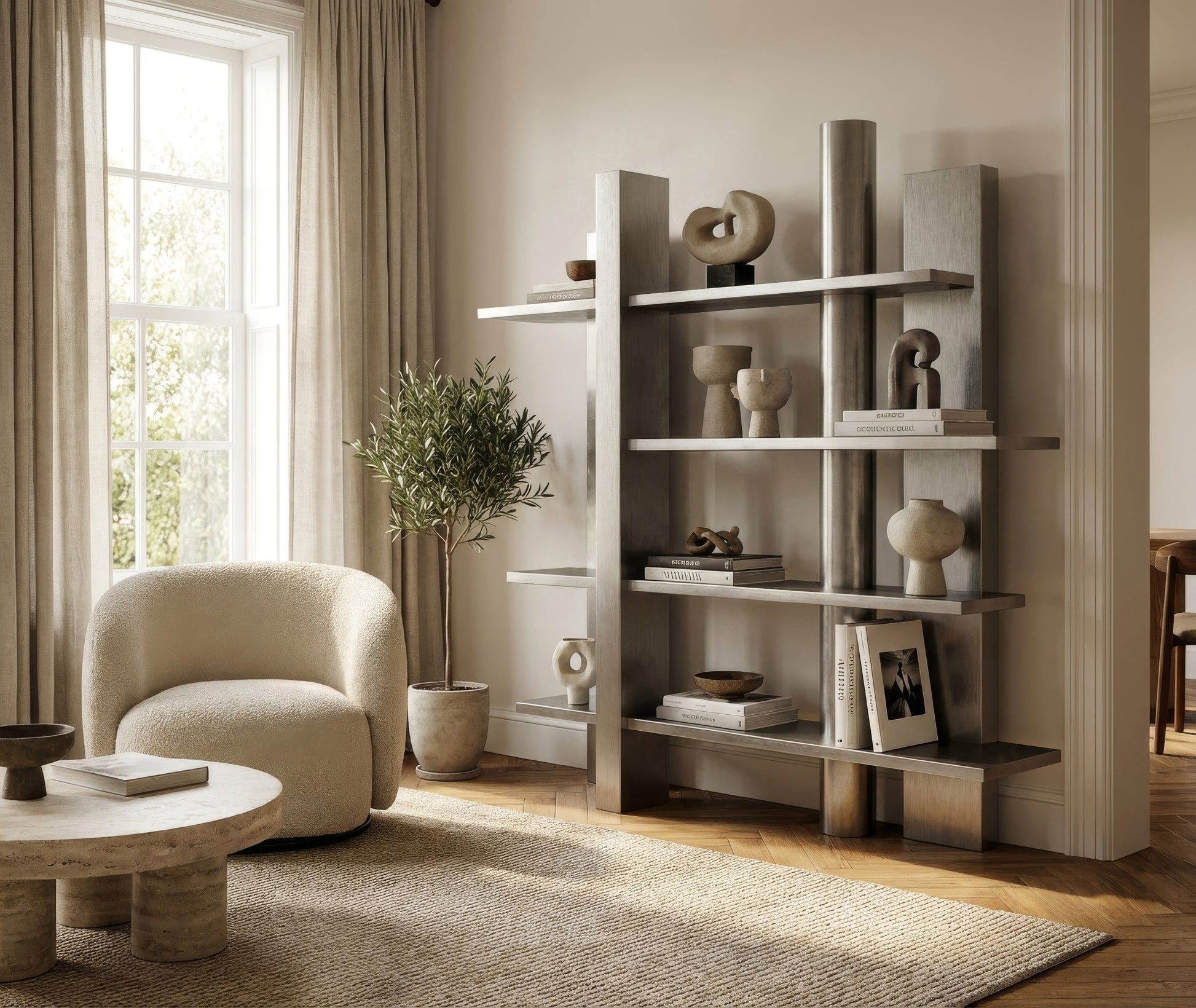 This bookshelf is a contemporary design piece that balances structure and visual lightness. Crafted in metal, its vertical elements and clean horizontal shelves create a rhythmic, architectural composition. Designed to display books and objects with elegance, this bookshelf brings both functionality and sculptural presence to refined, modern interiors, standing out for its timeless character and material honesty